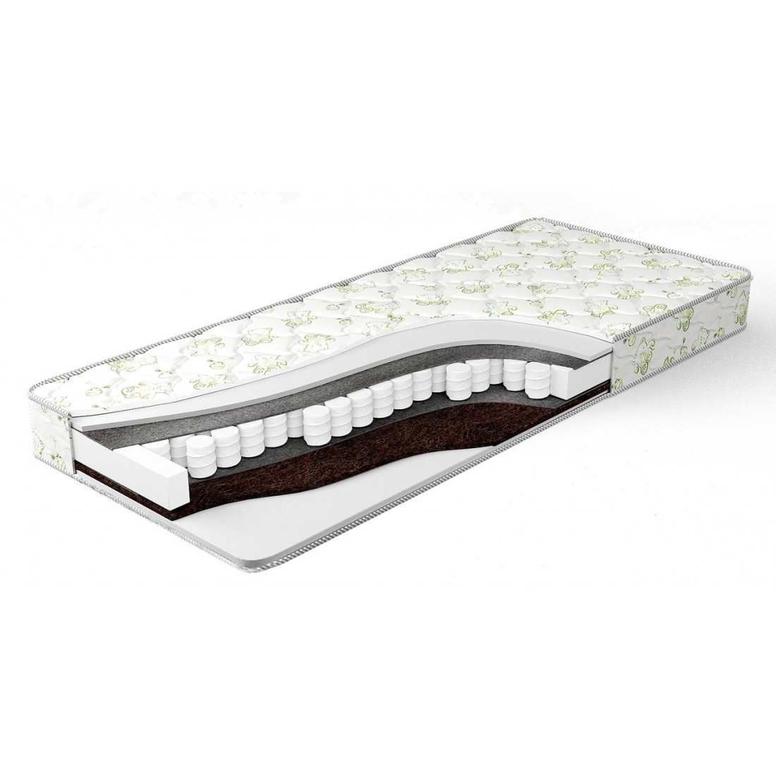 Наполнение: независимый блок TFK, высота блока 140 мм, ортопена 15 мм с двух сторон, кокосовая плита 10 мм с одной стороны, терморегулирующий слой с двух сторон, усиление по периметру - короб из ортопены.