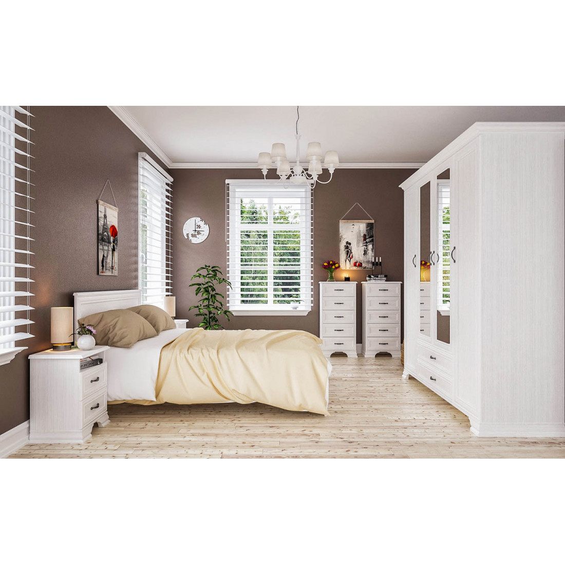 Мебель для спальни Юнона от фабрики Мебель-Неман композиция 3 - спальный гарнитур в классическом стиле с отделкой структурной фактуры, обрамленный рамочным фасадом, где металлические ручки выгодно подчёркивают стиль и изящество, всегда актуален и востребован.