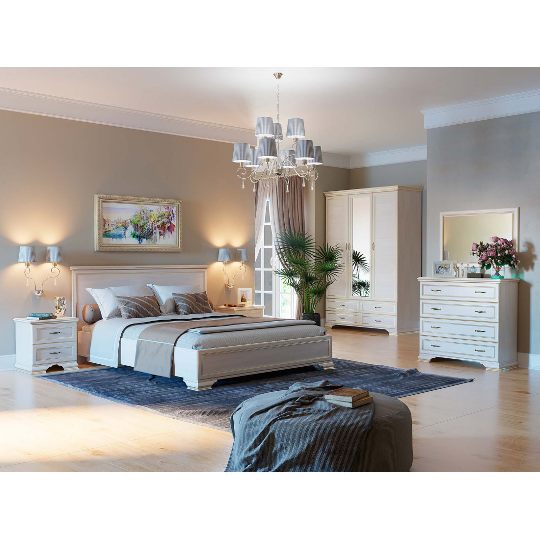 Модульная программа для спальни «Сиена» производится из высококачественных материалов и комплектуется лицевой фурнитурой премиум-класса в цвете «старая бронза». Для изготовления мебели применяется ЛДСП и МДФ в цвете «бодега белый» с эффектом патинирования золотом. Облик спальни дополняют рамочные фасады и карниз в классическом стиле, а также эффектные опоры из МДФ.